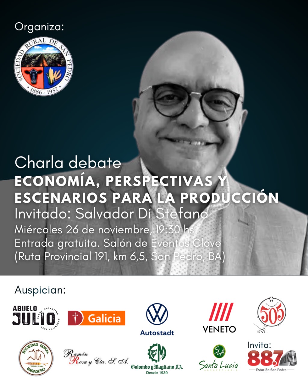 El reconocido consultor económico Salvador Di Stefano será el protagonista del encuentro organizado por la Sociedad Rural de San Pedro, que se realizará el miércoles 26 de noviembre a las 19:30 hs, en el Salón de Eventos Clove (Ruta Provincial 191, km 6,5).